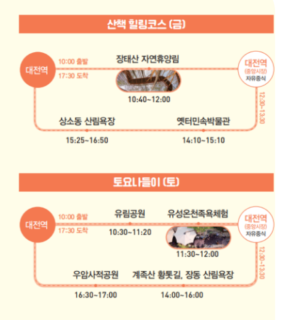 여기에 추가로, 아트코스, 숲스테이, 뮤직버스 투어 프로그램은 계절별로 테마투어로 운영이 됩니다. 위의 표를 참고하셔서 계절에 맞는 대전시티투어만의 여행의 묘미를 즐겨보시길 바랍니다.